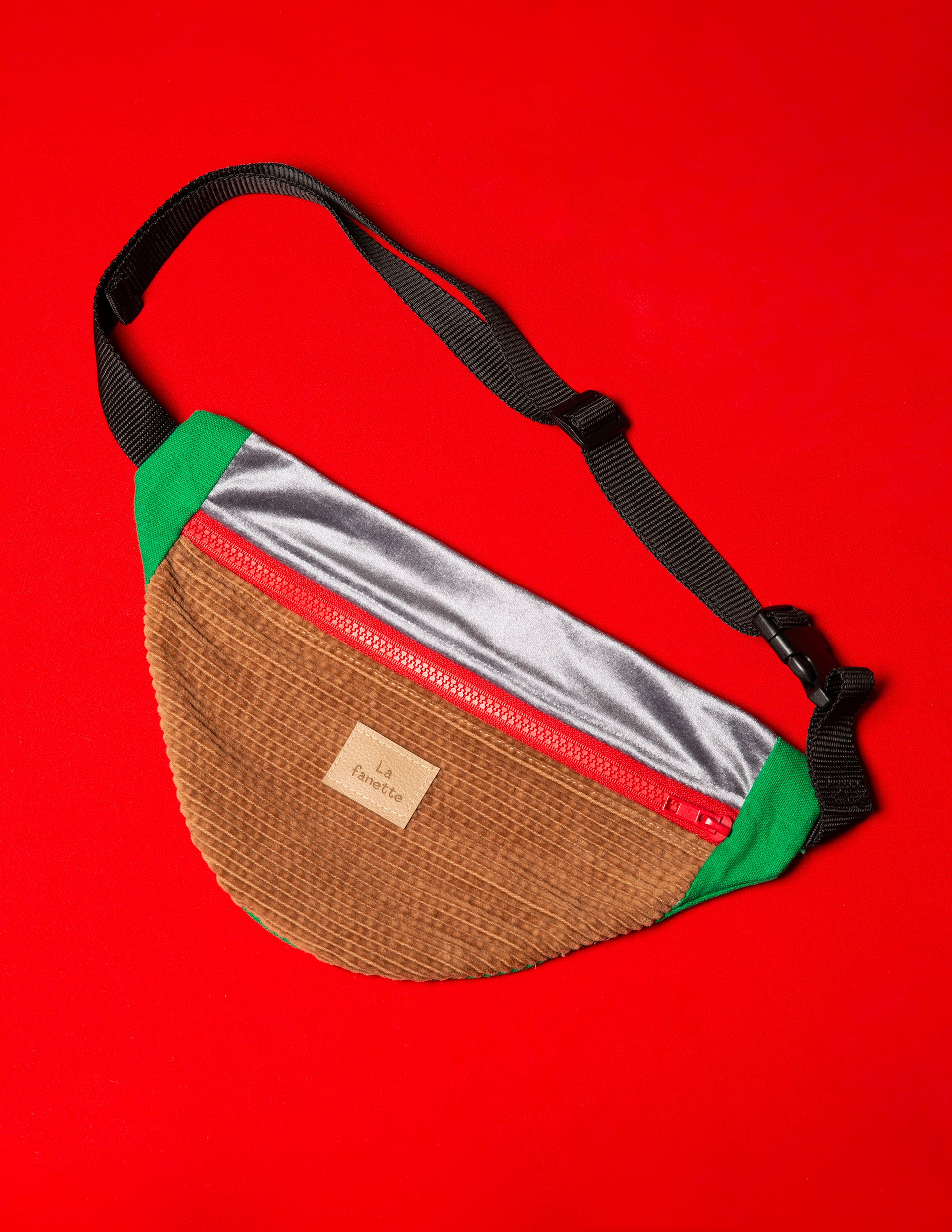 Je suis un Sac Banane Upcyclé LA FANETTE, confectionné avec soin en Haute-Normandie.
